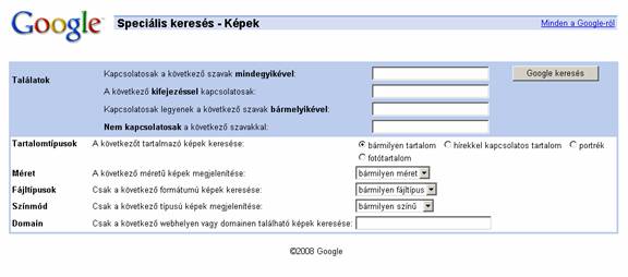 A Google Speciális keresés – képek (Images > Advanced Image Search) funkciójának beállításai