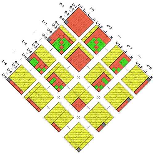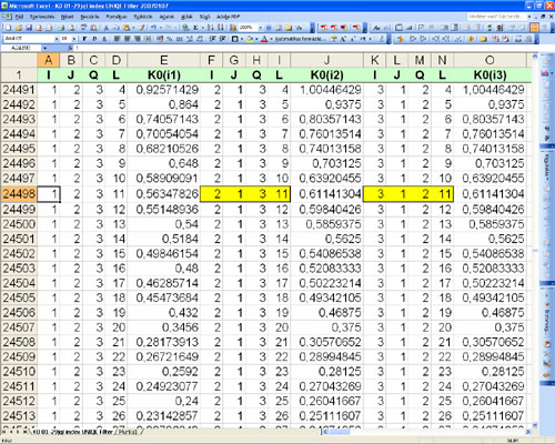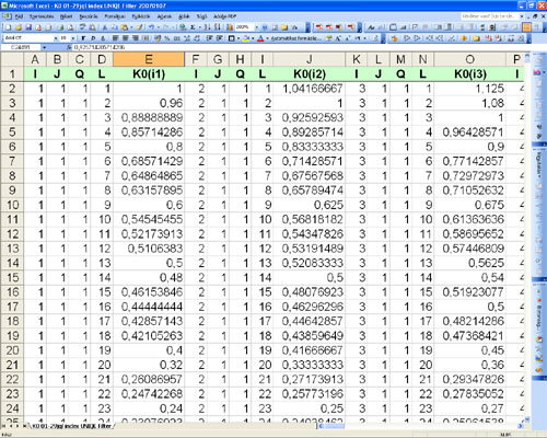 1. rész 2. rész 3. rész 4. rész 5. rész 6. rész 7. rész 8. rész 9. rész Számítógép múzeum van idehaza minálunk: 1990-ben váltottam fel a Commodore 64kb számítógépemet, Atari STE 4mb számítógéppel, majd 2000-ben melléjük vásároltam az első PC-met. Végül is, csak a PC-t használom (nem a 2000-ben vásároltat) amelyen az előző két gép is fut, bár ritkán, emulátor (utánzó) programok formájában. A Commodor hordozója a már megemlített VICE v1.22 program, ingyenesen letölthető a http://www.viceteam.org címről, az Atari-é a STEEM v3.2, úgyszintén ingyen hozzáférhető a http://steem.atari.st címen. A kísértés nagy volt. Sokáig nem hagyott nyugton a fogaskerék programom hordozójának „modernizálása”. Mígnem, a megoldás már ismert kulcskötegének birtokában, program íródott C++ és Turbo Pascal programokban is. Az érdekesebb azonban számomra, és remélem az alkotószellemű olvasóknak is, hogy a PTC MathCAD és az MS Excel programok használatával megalkottam az eredménymező „könyvespolcát” (lásd 3. rész, h. pontját). És valóban, a kezdetleges elgondolásom szerint, minden eredményt megérinthetek, áttekinthetek, turkálhatok közöttük. Előttem hevernek, nem épen a „földön”, de akár egy tálcán. Íme a „könyvespolc” mező: ![]() Ábra 39. : A PA és US-A váltófogaskerék (n=29) lehetséges összes egyszeri Ko megoldásai egyetlen egy MS Excel munkalapon, tenyérnyi nagyságura kicsinyítve: szélesség x magasság = 29(x5) x 9829 cella, a már megismertetett összesen C294=142 506 kombinációszámmal, mindegyik egy-egy cellában. Vázlat: LaVa Igen ám, de itt semmi sem látszik, csak a keretvonal-vezetés és az oszlopok?! Igen, itt mintha az űrből tekintenénk le reá, de hát azért van a +ZOOM. Az egész mezőn úgy lehet végigpásztázni, akár egy nagyítóval a LEPKE szárnyain! (lásd 3. részt). Még 1985-ben is a „Potisje” Ada szerszámgépgyár Termelés előkészítő osztályain (OPP és TPP) azon eszmecseréztek(tünk), sőt vitáztunk, bevezessék e a mikrofilmet, mint a technológiai lapok és a műszaki rajzok hordozóit, pausz (rajz)papír helyett!? Mint fiatal gépészmérnök, sehogyan sem akaródzott lelkesedi az ügyért, én már „a jövőbe láttam”, többedmagammal, egyetemtársaimmal, és egyértelműen a számítógépeket pártoltuk Végül, egy szekrénynagyságú gép lett a dologból, egy „Ei – Honeywell” számítógép, karakteres adattári lehetőségekkel, grafikai képességek nélkül. Felemás megoldás, „gép – alkatrész – szerelvény – munkautalvány- raktárkészlet” listák vezetésére. Már az Office 95 is simán zsebbe teszi mindezt, saját gépemen ezt 2003-ban tettem meg, szakmai szórakozásból (igen, vannak olyanok, akik így is szórakoznak), az Office 2000-el (lásd fenti 39. ábrát, és a rákövetkezőket). Kezdtem a PTC MathCAD programmal: ![]() Ábra 40.: Gyönyörű, kifejlett matematikai program. Ez itt a v14., akkor v2000. Számítások, függvények, egyenletek, mátrixok, sorok, integrálok, Boolean logika összefüggések, programozások, stb. elegáns megoldásainak elvégzésére. Vázlat: LaVa Itt is az indexváltozók bevezetésével szükségeltetik kezdeni, az ismert {i, J, Q L} jelzésűekkel, megszerkesztvén a MATRIX mezőt (nem a film folytatása, csak majdnem, mert fantázia itt is kell egy képzeletbeli dimenzióban). Definiáltam a váltófogaskerék készletét, fogszámosan, indexek terjedelmét és természetesen az áttételi szám egyenletét (lásd 2. részt): K0 = Zi/ZJ * ZQ/ZL ...............(6) A MathCAD munkafelülete túlságosan terjedelmes 1:1 méretarányú prezentálásra, ezért kivonatosan magát a mátrixot emelem ki, amely teljesen azonos matematikailag a részemről megalkotott és bemutatott eredménymezővel (EMV ; lásd 3. rész, i. pontját), amikor még MathCAD nem is volt (1986), de matematika nagyon is: ![]() Ábra 41.: Az eredménymező (EMV) tisztán MATRIX kinézete, a MathCAD programban. Vázlat: LaVa Megfuttatással már peregnek is kifelé az eredmények, most még szűretlenül, nyersen: ![]() Ábra 42.: A MathCAD-ban generált eredménymező oszlopok, az első öt(5). Gyakorlatiasság végett „i” oszlopokként felosztásban, mert különben nem illeszthetem át az EXCEL munkalap egy(1) oszlopába (max 65536). És így huszonkilencig (29). A oszlopok valós hosszai 24389 (!) Ko adat, a C294 ismétlődő kombinációk száma. A MathCAD sem közli le, de megjegyzi mindegyiket. Vázlat: LaVa A közismert számítógépes rutin Copy – Paste művelet pár végrehajtása az oszlopok felet és már meg is történt a beágyazás az Excel munkalap előre kialakított külalakja szerinti oszlopaiba, és így huszonkilencszer (29), nyolc (8) tizedes pontossággal: ![]() Ábra 43.: Íme, az EXCEL munkalapon a Ko eredménymező MARTIX -ja, -ZOOM nélkül: szélesség x magasság = 29(x5) x 24389 = 3 536 405 cella, téglalap formában! Szembeötlően „piszkosak” az adatok, mert például i,j,q,l = 1,1,1,1 nem létezik a váltófogaskerék-készletben. Be kell vetni a már többször emlegetett megoldás kulcsköteget. Vázlat: LaVa Az Excel táblázat a 43. ábrán hűen tükrözi a LEPKESZÁRNY alkotó mezőit. Akár a megemlített eredménymezővel (EMV ; lásd 3. rész, i. pontját), vagy magával a LEPKÉVEL is összevethető (lásd 3. rész, 9a. ábráját), gondolok itt az azonosan színes mezők azonos meghatározására! KULCSKÖTEG: ki kell szűrni az egyenlő, megismétlődő {i,j,q,l} indexértékeket (sárga mezők), valamint az egyforma eredetű Ko értékeket: a/b*c/d = c/d*a/b = a/d * c/b = c/b * a/d (piros mezék). ![]() Ábra 44.: A MATRIX LEPKÉJE, itt még darabos formában. Vázlat: LaVa Egykoron, nem a lepke irányban indultam el, tehát színezéssel, hanem a kiszűrt felesleges adatok amputációját (elimináció, kihagyás) hajta