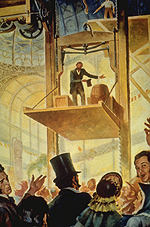 Elisha Graves Otis bemutatja biztonsági felvonóját a New Yorki Crystal Palace-ban 1854-ben