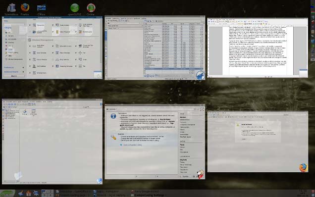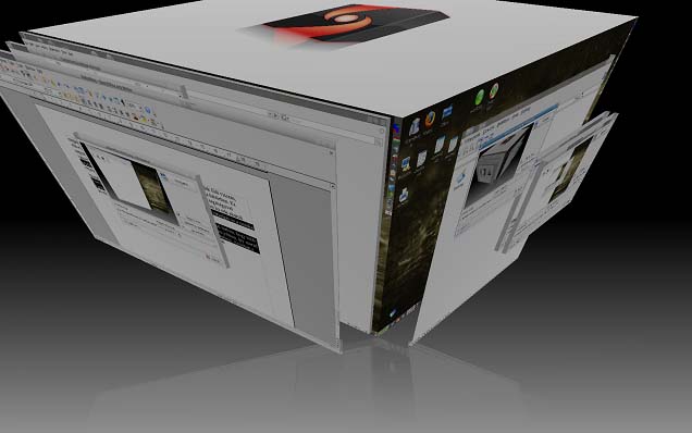 Na de nézzünk nagyobb dolgok után. Érdekes jelenség a többasztalos mód használata, amikor egy kocka oldalain helyezkednek el az ablakok, és a kockát az egér segítségével elforgathatjuk a megfelelő pozícióba, vagyis virtuális asztalra fordítjuk le. Megjegyzem, nekem továbbra is kényelmesebb a billentyűzeten lévő gyorsító gomb használata, azonban egérfüggő társaim jó hasznát fogják venni a fenti megoldásnak, mivel egyszerre több asztalt is látnak, és előbb eljutnak a kívánthoz. Azonban sokkal jobb funkció az, hogy az összes asztalt egy falra kicsinyíthetem egyetlen egér-mozdulattal (a bal felső sarokba rántom az egeret), így szépen látom, hogy melyik asztalon mi van, hogyan állnak a félbehagyott munkáim, ami sokszor meggyorsította már a keresgélést az asztalok között. Ugyanilyen jó funkciónak tartom az ablakok kiterítését, vagyis ha a jobb felső sarokba rántom az egeret, akkor az összes asztalon lévő ablakot elrendezi a képernyőn kicsinyítve, hogy áttekinthetően lássam őket. Ezzel pillanatok alatt arra az ablakra/programra kattinthatok, melyre szükségem van, felejtsük tehát el az ALT+TAB kombinációs forgatást. Természetesen, ha rákattintok egy ilyen kicsinyített ablakra, az összes ablak az eredeti pozícióba áll vissza, csupán a kiválasztott ablak kerül felülre. Ez akkor is segít, ha egy program nem reagál semmire, mert egy másik ablakban bevitelt vár (hibajelzés), de a kérdéses ablak valami folytán alulra került. Így pillanatok alatt látom, hol a probléma, ami jelentősen gyorsítja a munkát. Meg kell hagyni, hogy mindezen funkciók megoldhatóak lettek volna külön repülgetések nélkül is, de ha nem terheli a gépet, felőlem röpködhetnek azok az ablakok, váltások, nem lassul velük a munka, mivel a másodperc tört része alatt zajlik le az animáció.