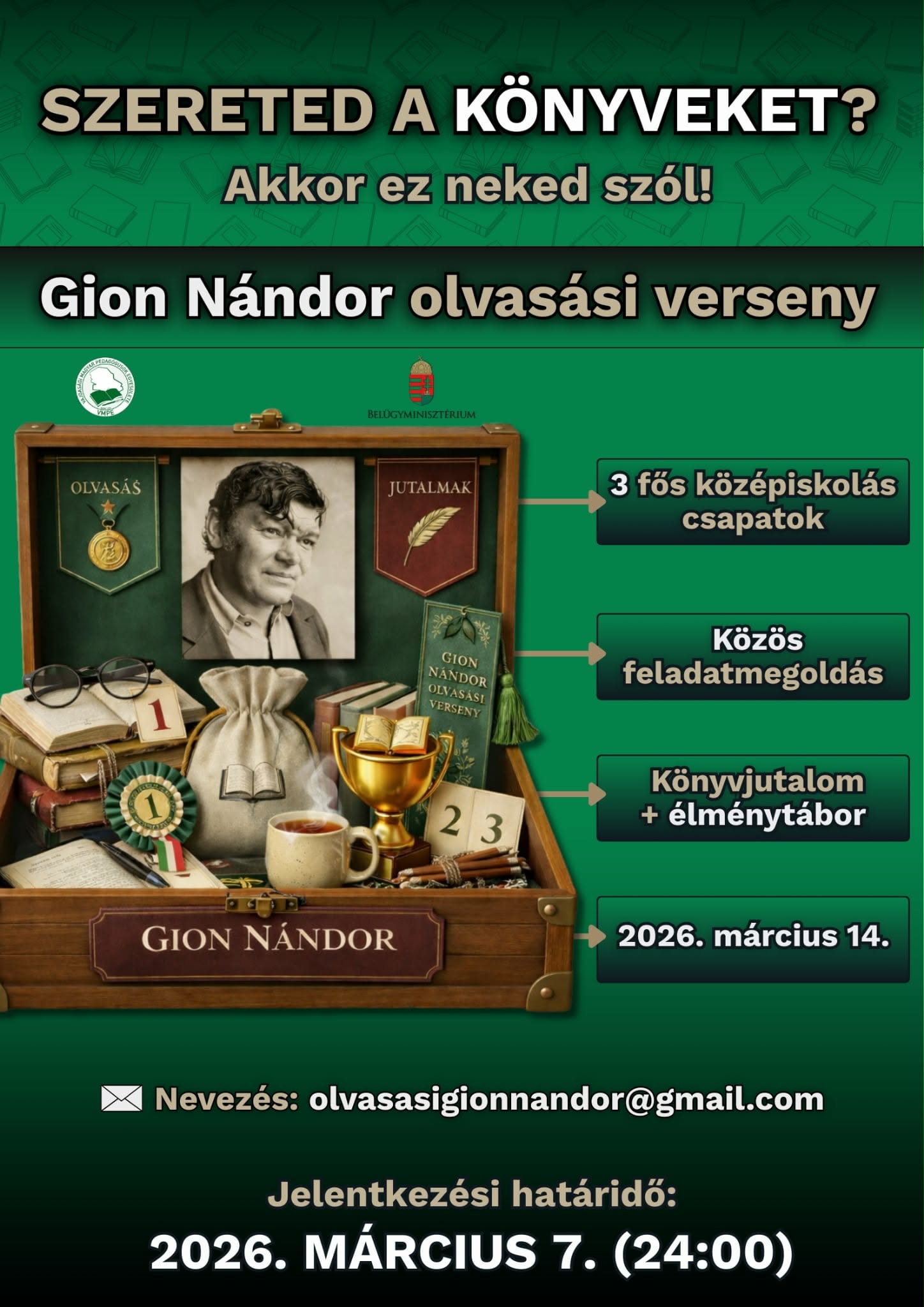 Szereted a könyveket? Szívesen olvasol izgalmas, érdekes történeteket? Akkor ez a verseny Neked Izgalmas történetek, közös feladatok, jó hangulat és értékes nyeremények! A verseny menete: A jelentkezők háromfős csapatokban vesznek részt a versenyen, a csapattagok előre egyeztetik, hogy a megadott könyvlistáról ki melyik művet olvassa el. Egy-egy tanulónak legkevesebb két művet kell elolvasnia, de természetesen minél többet olvas el, annál sikeresebb lesz a verseny kimenetele. A döntőben a csapat az 5 irodalmi műből kapja a teszteket és feladatlapokat. A csapatok A verseny 2026. március 14-én (szombaton) lesz Újvidéken az Apáczai Diákotthonban. A legjobbak könyvjutalomban részesülnek, és jogot nyernek a Gion Nándor Irodalmi és Művészeti Az olvasandó művek listája Elsősök és másodikosok csoportja: Harmadikosok és negyedikesek csoportja: Jelentkezni március 7-ig lehet a következő e-mail címre: olvasasigionnandor@gmail.com A jelentkezéshez a következő információkat kell elküldeniük a fent említett e-mail címre: az A könyvek kérésre PDF formátumban is elérhetők.