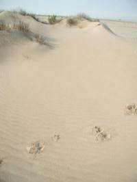 Friss oroszlánnyomok a sivatag homokjában